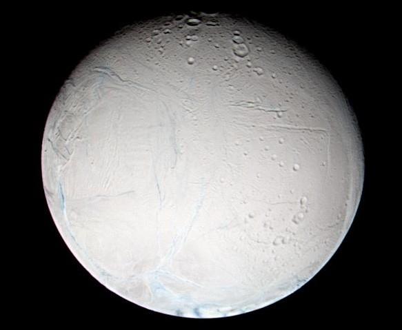 Explanation: Small, icy, inner moon of Saturn, Enceladus is only about 500 kilometers in diameter. But the distant world does reflect over 90 percent of the sunlight it receives, giving its surface about the same reflectivity as fresh snow. Seen here in a sharp view from the Cassini spacecraft's recent flyby, Enceladus shows a variety of surface features and very few impact craters - indicating that it has been an active world even though this tiny moon should have completely cooled off long ago. In fact, the resurfaced appearance of Enceladus could be the result of liquid water geysers or water volcanos. Since Enceladus orbits within the outer E ring of Saturn, the moon's surface may be kept snow-bright as it is continuously bombarded with icy ring particles. Eruptions on Enceladus itself would in turn supply material to the E ring. Interplanetary ski bums take note: tiny Enceladus has only about 1/100th the surface gravity of planet Earth and a surface temperature of -200 degrees C (-330 degrees F).