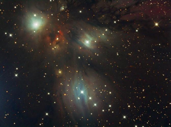 Explanation: In this beautiful celestial still life composed with a cosmic brush, dusty nebula NGC 2170 shines at the upper left. Reflecting the light of nearby hot stars, NGC 2170 is joined by other bluish reflection nebulae and a compact red emission region against a backdrop of stars. Like the common household items still life painters often choose for their subjects, the clouds of gas, dust, and hot stars pictured here are also commonly found in this setting - a massive, star-forming molecular cloud in the constellation Monoceros. The giant molecular cloud, Mon R2, is impressively close, estimated to be only 2,400 light-years or so away. At that distance, this canvas would be about 15 light-years across.