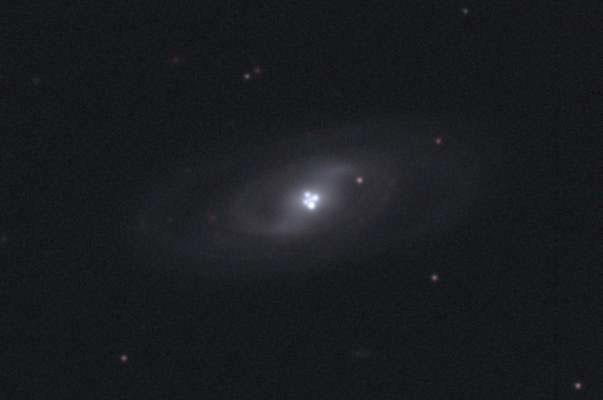 Explanation: Most galaxies have a single nucleus -- does this galaxy have four? The strange answer leads astronomers to conclude that the nucleus of the surrounding galaxy is not even visible in this image. The central cloverleaf is rather light emitted from a background quasar. The gravitational field of the visible foreground galaxy breaks light from this distant quasar into four distinct images. The quasar must be properly aligned behind the center of a massive galaxy for a mirage like this to be evident. The general effect is known as gravitational lensing, and this specific case is known as the Einstein Cross. Stranger still, the images of the Einstein Cross vary in relative brightness, enhanced occasionally by the additional gravitational microlensing effect of specific stars in the foreground galaxy.
