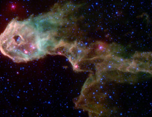 Explanation: In December of 2003, the world saw spectacular first images from the Spitzer Space Telescope, including this penetrating interior view of an otherwise opaque dark globule known as the Elephant's Trunk Nebula. Seen in a composite of infrared image data recorded by Spitzer's instruments, the intriguing region is embedded within the glowing emission nebula IC 1396 at a distance of 2,450 light-years toward the constellation Cepheus. Previously undiscovered protostars hidden by dust at optical wavelengths appear as bright reddish objects within the globule. Shown in false-color, winding filaments of infrared emission span about 12 light-years and are due to dust, molecular hydrogen gas, and complex molecules called polycyclic aromatic hydrocarbons or PAHs. The Spitzer Space Telescope was formerly known as the Space Infrared Telescope Facility (SIRTF) and is presently exploring the Universe at infrared wavelengths. Spitzer follows the Hubble Space Telescope, the Compton Gamma-ray Observatory, and the Chandra X-ray Observatory as the final element in NASA's space-borne Great Observatories Program.