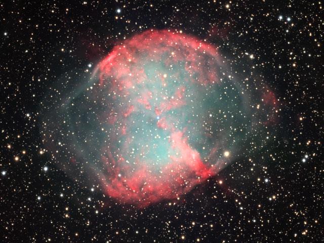 Explanation: The first hint of what will become of our Sun was discovered inadvertently in 1764. At that time, Charles Messier was compiling a list of diffuse objects not to be confused with comets. The 27th object on Messier's list, now known as M27 or the Dumbbell Nebula, is a planetary nebula, the type of nebula our Sun will produce when nuclear fusion stops in its core. M27 is one of the brightest planetary nebulae on the sky, and can be seen in the constellation Vulpecula with binoculars. It takes light about 1000 years to reach us from M27, shown above, digitally sharpened, in three standard colors. Understanding the physics and significance of M27 was well beyond 18th century science. Even today, many things remain mysterious about bipolar planetary nebula like M27, including the physical mechanism that expels a low-mass star's gaseous outer-envelope, leaving an X-ray hot white dwarf.