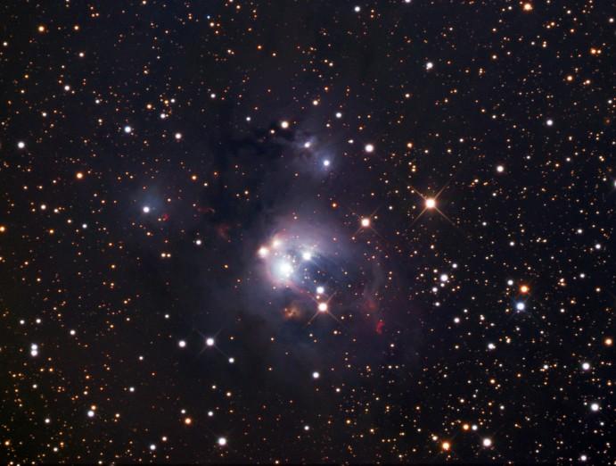 Explanation: Young suns still lie within dusty NGC 7129, some 3,000 light-years away toward the royal constellation Cepheus. While these stars are at a relatively tender age, only about a million years old, it is likely that our own Sun formed in a similar stellar nursery some five billion years ago. Most noticeable in the striking image are the lovely bluish dust clouds that reflect the youthful starlight, but the smaller, deep red crescent shapes are also markers of energetic, young stellar objects. Known as Herbig-Haro objects, their shape and color is characteristic of glowing hydrogen gas shocked by jets streaming away from newborn stars. Ultimately the natal gas and dust in the region will be dispersed, the stars drifting apart as the loose cluster orbits the center of the Galaxy. NGC 7129 is about 10 light-years across. Watch: the Perseid Meteor Shower
