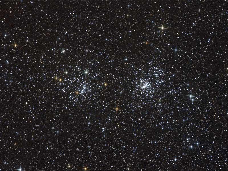 Explanation: Most star clusters are singularly impressive. Open clusters NGC 869 and NGC 884, however, are doubly impressive. Also known as "h and chi Persei", this unusual double cluster, shown above, is bright enough to be seen from a dark location without even binoculars. Although their discovery surely predates written history, the Greek astronomer Hipparchus notably cataloged the "double cluster". The clusters are over 7,000 light years distant toward the constellation of Perseus, but are separated by only hundreds of light years.