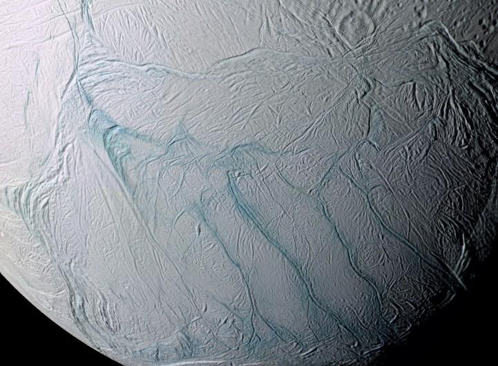 Explanation: Based on data from Cassini spacecraft instruments, researchers are now arguing that liquid water reservoirs exist only tens of meters below the surface of Saturn's small (500 kilometer diameter) but active moon Enceladus. The exciting new results center around towering jets and plumes of material erupting from the moon's surface. The plumes originate in the long tiger stripe fractures of the south polar region pictured here. Detailed models suport conclusions that the plumes arise from near-surface pockets of liquid water at temperatures of 273 kelvins (0 degrees Celsius), even though Enceladus has a surface temperature of about 73 kelvins (-200 degrees Celsius). Clearly an important step in the search for water and the potential for the origin of life beyond planet Earth, such near-surface reservoirs of water would be far more accessible than, for example, the internal ocean detected on the Jovian moon Europa.