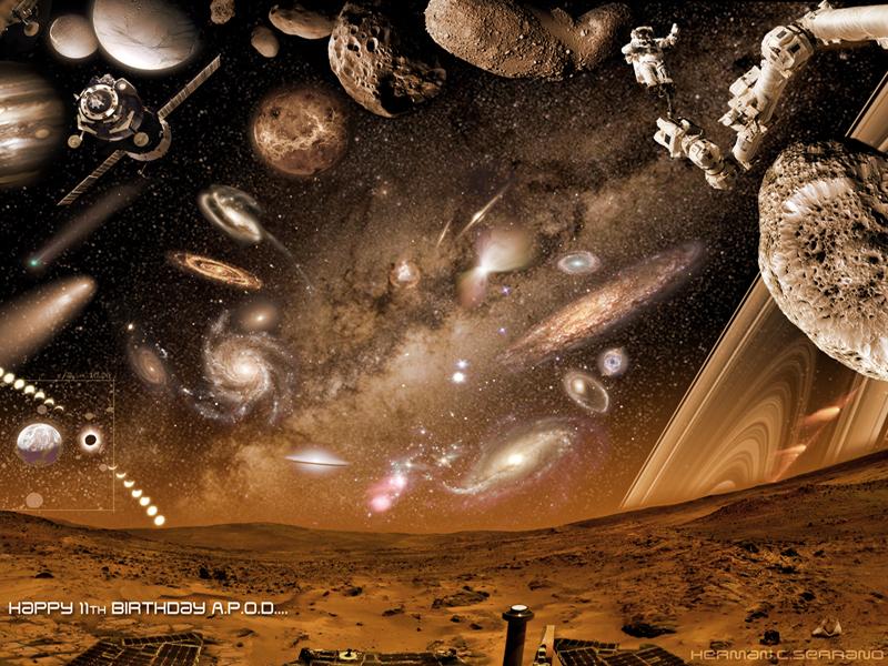 Explanation: The first APOD appeared eleven years ago today, on 1995 June 16. Although garnering only 14 page views on that day, we are proud to estimate that APOD has now served over 400 million space-related images over the last eleven years. That early beginning, along with a nearly unchanging format, has allowed APOD to be a consistent and familiar site on a web frequently filled with change. Many people don't know, though, that APOD is now translated daily into many major languages. We again thank our readers and NASA for their continued support, but ask that any potentially congratulatory e-mail go to the folks who created the great pictures -- many times with considerable effort -- that APOD has been fortunate enough to feature over the past year. Many can be contacted by following links found in the credit line under the image. Some of these images are featured in the above spectacular collage of a fantasy sky above Mars submitted by an enthusiastic APOD reader skilled in digital image manipulation. How many APOD images can you identify?