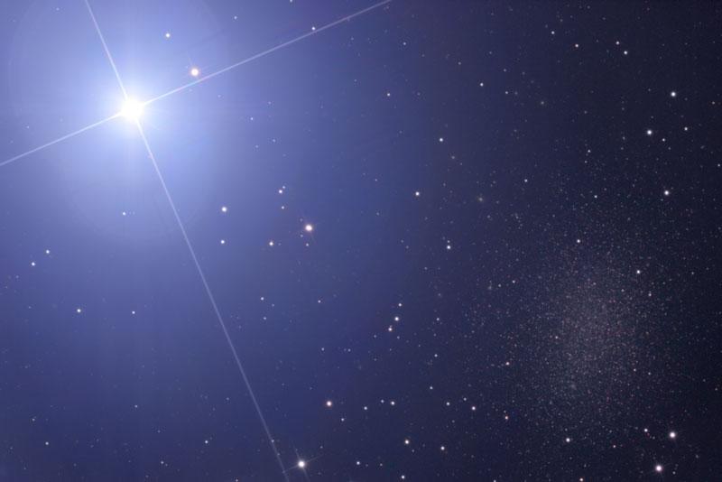 Explanation: The star on the upper left is so bright it is sometimes hard to notice the galaxy on the lower right. Both the star,