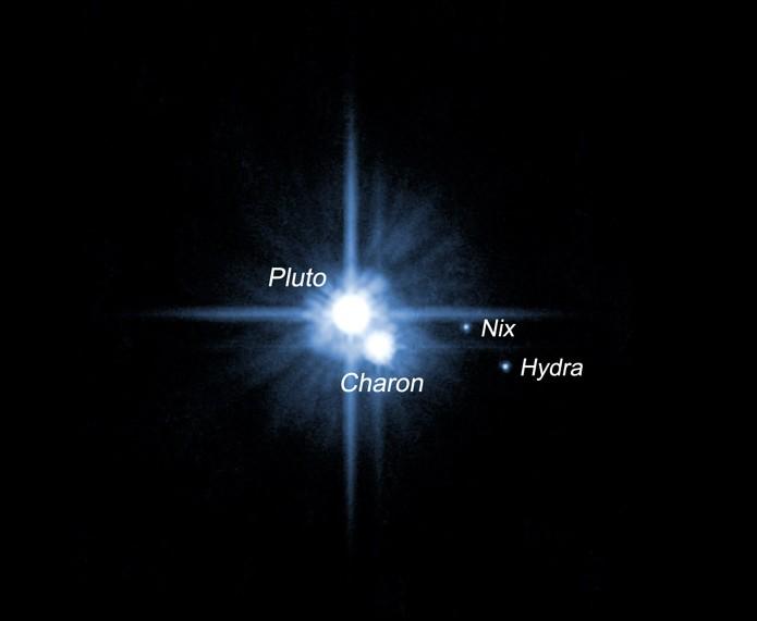 Explanation: Discovered in mid-2005, Pluto's small moons were provisionally designated S/2005 P1 and S/2005 P2. They have now been officially christened Nix and Hydra. Compared to Pluto and its large moon Charon, at 2,360 and 1,210 kilometers in diameter respectively, Nix (inner moon) and Hydra (outer moon) are tiny, estimated to be only 40 to 160 kilometers across. Pluto and Charon are bright enough to create diffraction spikes in this Hubble Space Telescope image, but Nix and Hydra are some 5,000 times fainter than Pluto and appear only as small points of light. Still, their new names are appropriate for the distant Pluto system. In mythology, Nix was the goddess of darkness and night and the mother of Charon, while Hydra was a nine headed monster and is now orbiting the solar system's ninth planet. Of course Nix and Hydra also share initials with the pluto-bound spacecraft New Horizons.