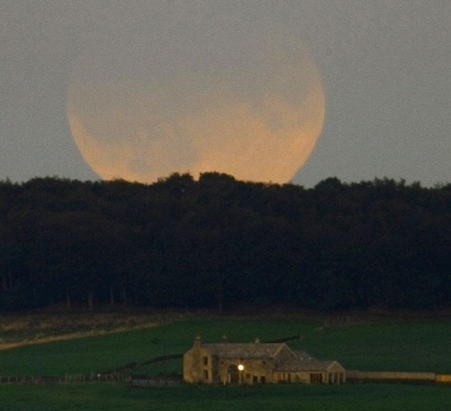 Pictured above, a partially eclipsed Moon is seen rising over an estate in