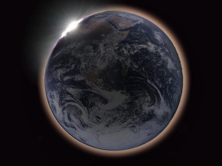 Explanation: Parts of Saturday's (March 3) lunar eclipse will be widely visible. For example, skywatchers in Europe, Africa, and western Asia will be able to see the entire spectacle of the Moon gliding through Earth's shadow, but in eastern North America the Moon will rise already in its total eclipse phase. Of course if you traveled to the Moon's near side, you could see the same event as a solar eclipse, with the disk of our fair planet Earth completely blocking out the Sun. For a moon-based observer's view, graphic artist Hana Gartstein (Haifa, Israel) offers this composite illustration. In the cropped version of her picture, an Apollo 17 image of Earth is surrounded with a red-tinted haze as sunlight streams through the planet's dusty atmosphere. Earth's night side remains faintly visible, still illuminated by the dark, reddened Moon, but the disk of the Earth would appear almost four times the size of the Sun's disk, so the faint corona surrounding the Sun would be largely obscured. At the upper left, the Sun itself is just disappearing behind the Earth's limb.