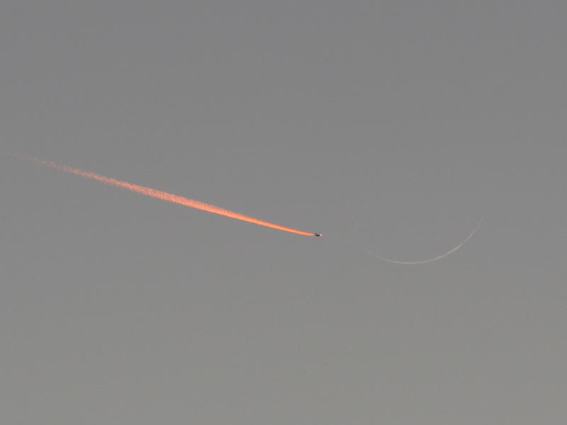 The plane crossed the Moon. The contrail dispersed. The Sun set. The Moon set.