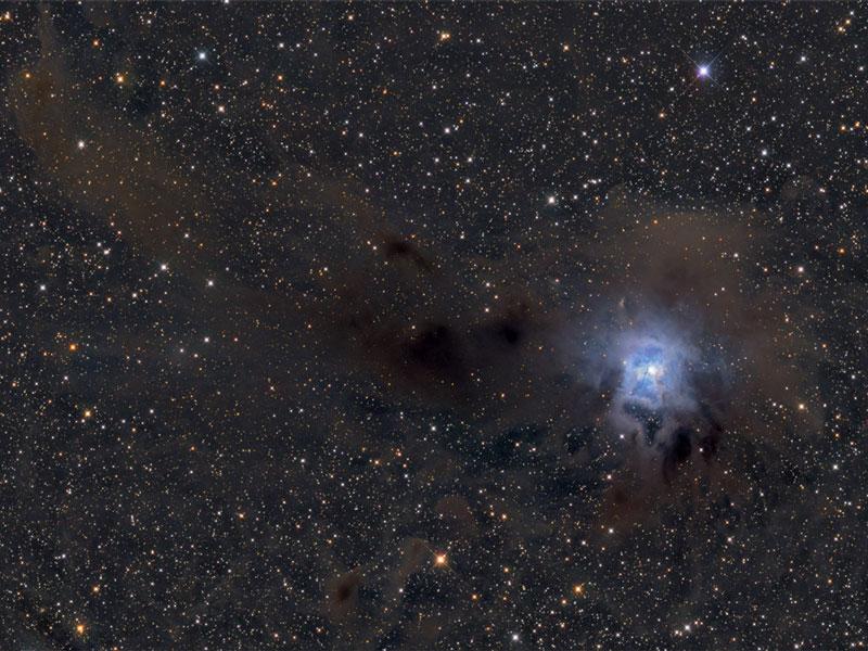 Explanation: Like delicate cosmic petals, these clouds of interstellar dust and gas have blossomed 1,300 light-years away in the fertile star fields of the constellation Cepheus. Sometimes called the Iris Nebula and dutifully cataloged as NGC 7023, this is not the only nebula in the sky to evoke the imagery of flowers. Still, this beautiful digital image shows off the Iris Nebula's range of colors and symmetries in impressive detail. Within the Iris, dusty nebular material surrounds a massive, hot, young star in its formative years. Central filaments of cosmic dust glow with a reddish photoluminescence as some dust grains effectively convert the star's invisible ultraviolet radiation to visible red light. Yet the dominant color of the central nebula is blue, characteristic of dust grains reflecting starlight. Dark, obscuring clouds of dust and cold molecular gas are present on the left of the image, and lead the eye to see other convoluted and fantastic shapes. Infrared observations indicate that this nebula may contain complex carbon molecules known as PAHs. As shown here, the bright blue portion of the Iris Nebula is about six light-years across.